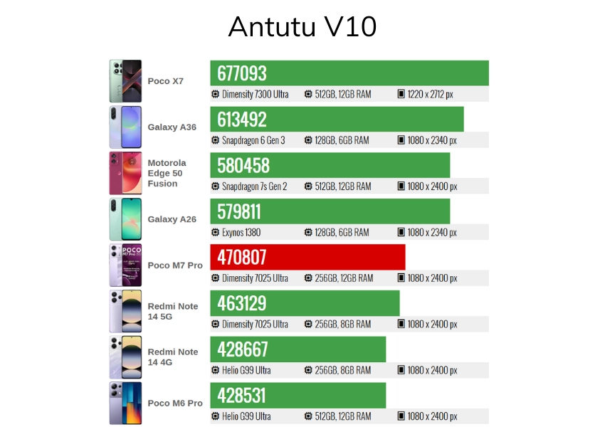 Cung cấp sức mạnh cho POCO M7 Pro 5G là con chip MediaTek Dimensity 7025-Ultra (6nm). Đây là dòng chip được tối ưu riêng cho các thiết bị Xiaomi, mang lại điểm số Antutu ấn tượng (hơn 470,000 điểm).