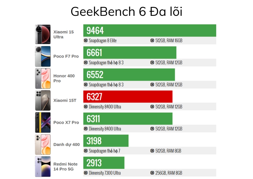 Trái tim của Xiaomi 15T là con chip Dimensity 8400-Ultra mới nhất từ MediaTek. Qua các bài test benchmark, con chip này cho điểm số Antutu gần 2 triệu điểm, vượt qua nhiều đối thủ trong cùng tầm giá.